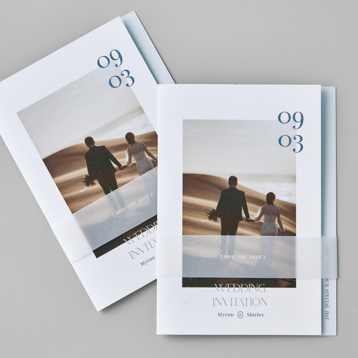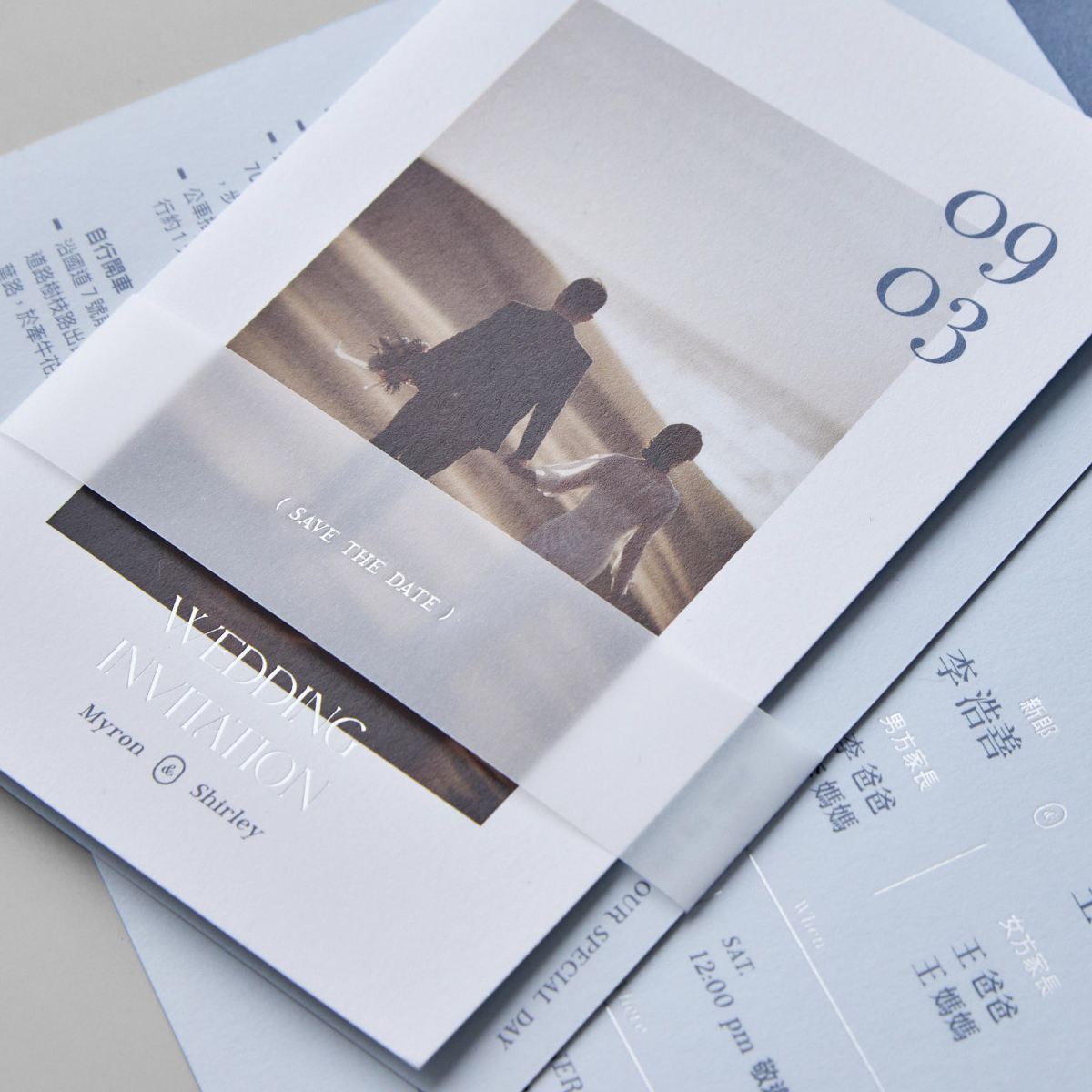 獨特的對摺喜帖,搭配燙色的描圖紙腰封,