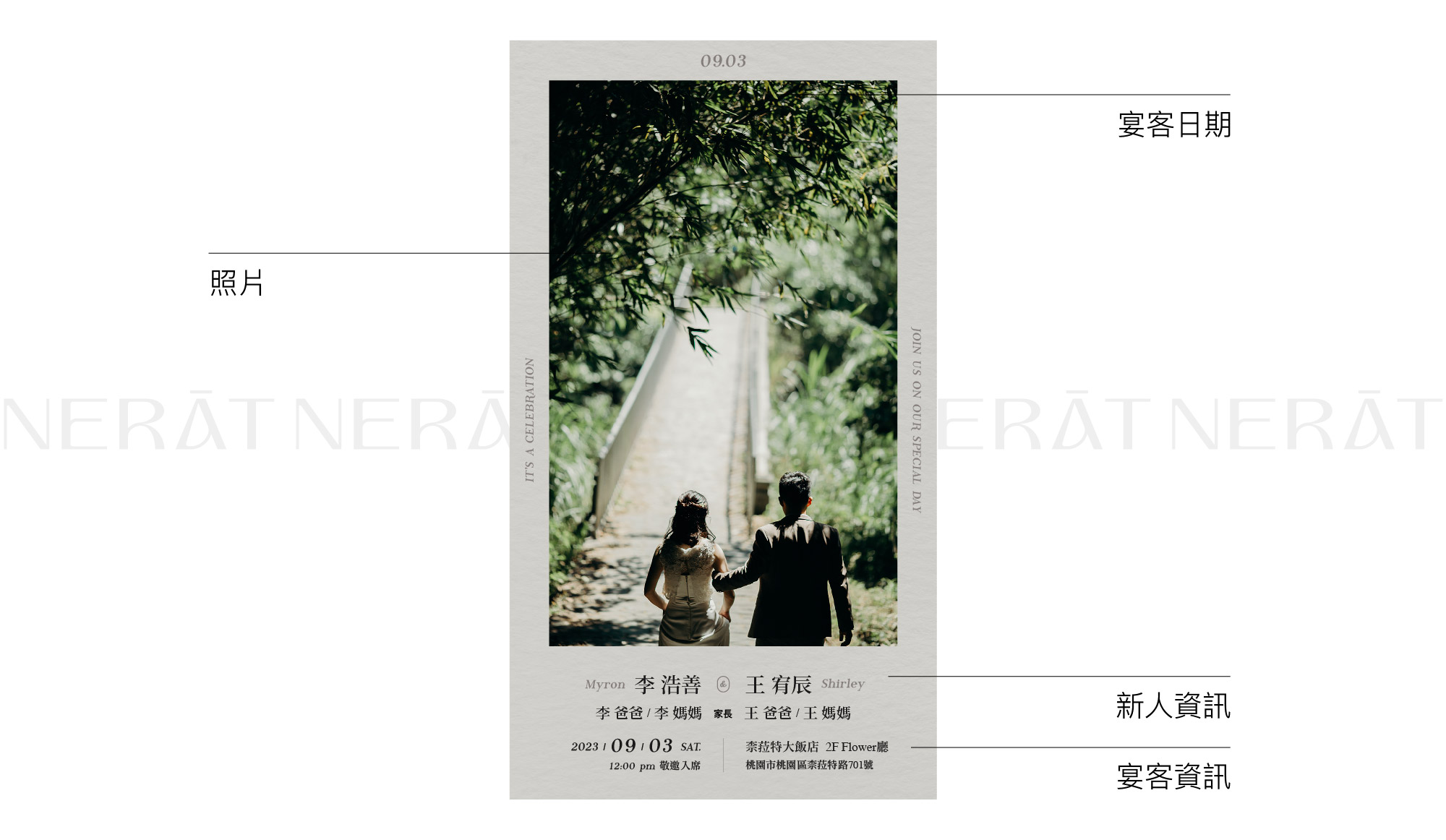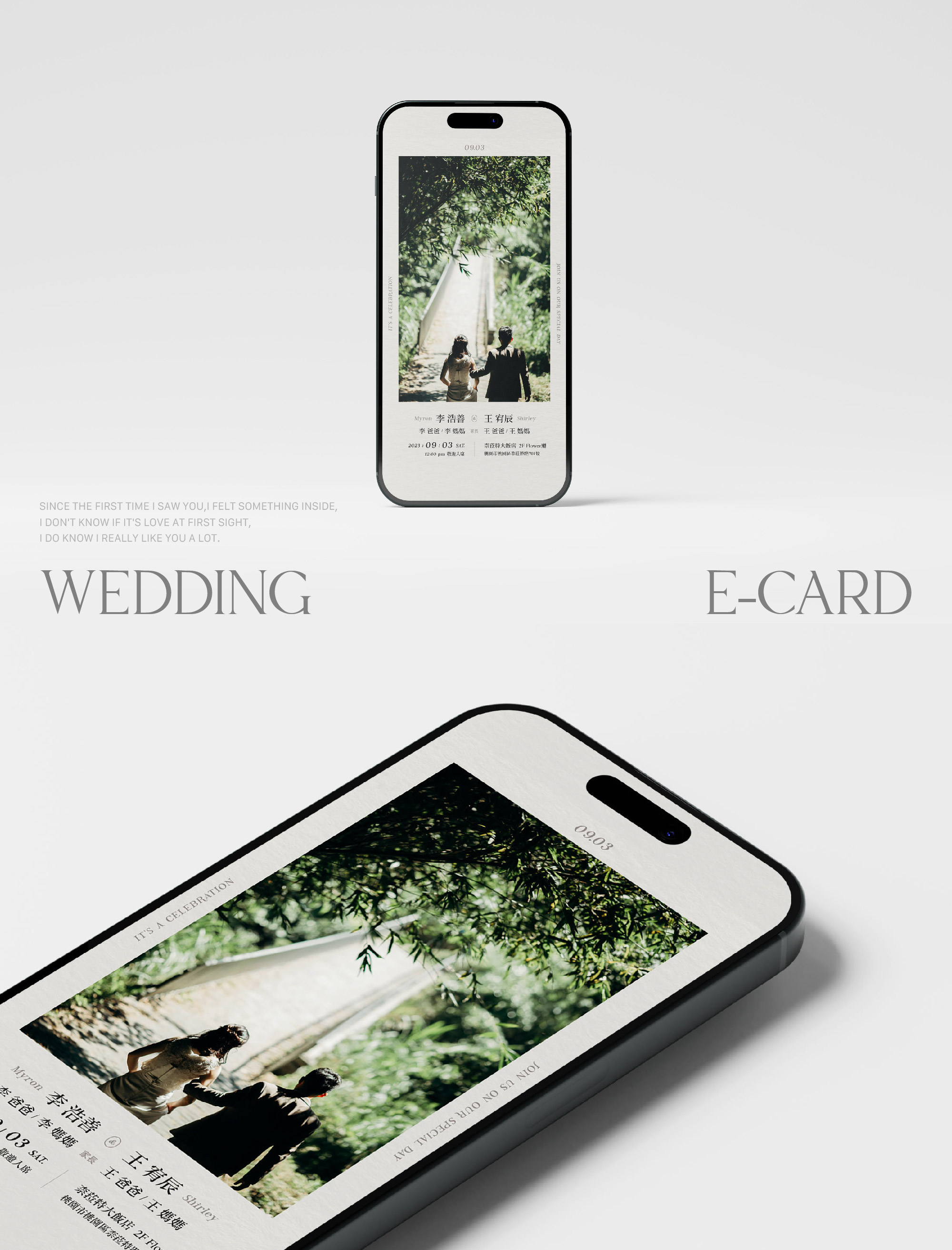 通過郵件、社交媒體分享您的喜帖,讓您的親朋好友輕鬆收到您的喜訊。我們的設計將為您的婚禮增添一絲獨特的魅力.ᐟ✦ 電子喜帖整體配色可自行挑選搭配